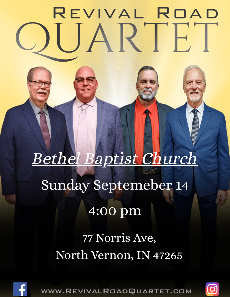 Founded in 2010 and based in Greenwood, Indiana, Revival Road is a Southern Gospel quartet singing in traditional style. They include classic, current, and original Southern Gospel songs in their musical ministry.